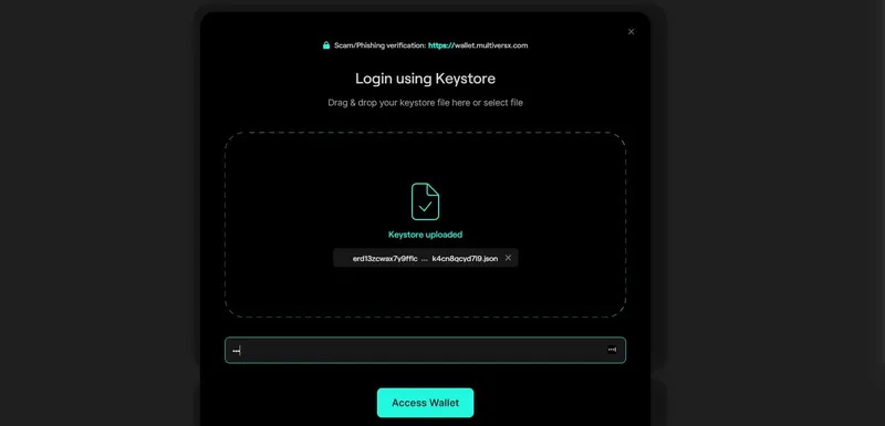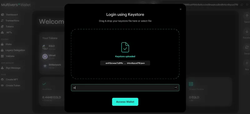 2. You can log in by using the Keystore File and the corresponding password for the MultiversX Web Wallet: