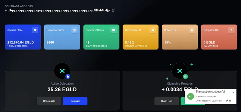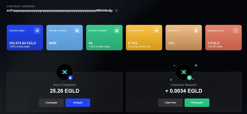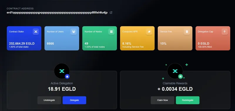 3. Welcome to Delegation Manager dashboard! You are now able to visualize the amount of $EGLD which you deposited in your Active Delegation and your Claimable Rewards: