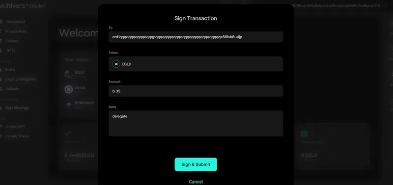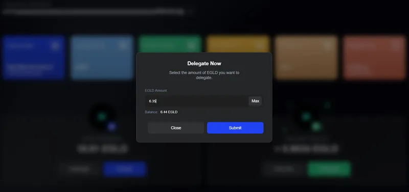 4. Now access the “Delegate” button, write down the amount of $EGLD you want to delegate, then click on “Submit”: