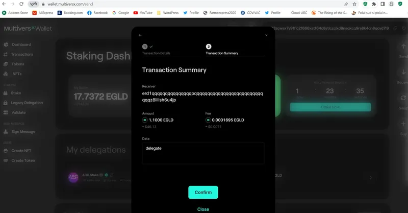 7. Analyse the details of your request (Receiver, Amount, Fee, Data), then “Confirm”, if you agree: